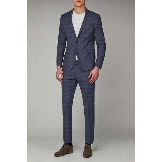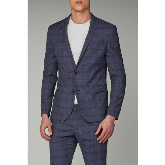 Chambray Check Skinny Fit Suit Jacket by Ben Sherman. Cool and progressive, Ben Sherman tailoring is adept in smart, refined pieces and casual suiting. With a sharp focus on fit and cut, the modern silhouette has a skinny profile – styled with narrow lapels, sloped shoulder lines and a single vent for a contemporary frame. In a slate with rust chambray check, the suit is cut from a stretch cloth for absolute comfort. This stunning suit is a transitional piece that will take you from wedding to weekend. Wear smart with a button down Oxford shirt and black brogues, or casual with grey t-shirt and trainers.