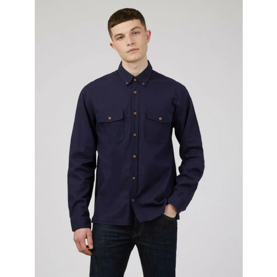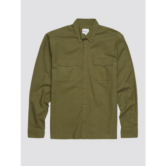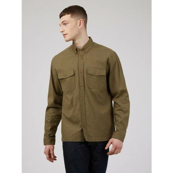 Cotton Linen Overshirt by Ben Sherman. A long sleeve summer overshirt in a cotton linen blend. Features include 2 chest pockets with flap and button fastening, and a 2 finger button down collar. This shirt comes in a relaxed fit, perfect for spring layering. Branded with the Ben Sherman woven side tab.