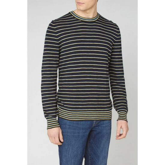 Cotton Slub Stripe Crew by Ben Sherman. 100% cotton crew neck in an all over stripe slub design. This jumper is designed with a 2 colour contrast stripe throughout and also features a striped rib at the collar, hem and cuffs. Branded with the Ben Sherman side tab.