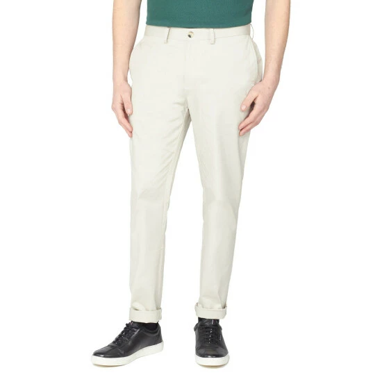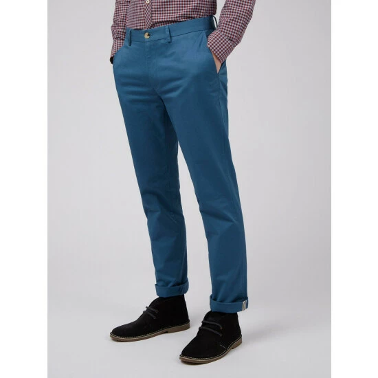 Cotton stretch chino trousers in a slim fit from Ben Sherman, a part of its signature range. Featuring 5 pockets and tape detailing on the turn up hem. Ideal for styling with a polo shirt and a Harrington jacket for a casual look.