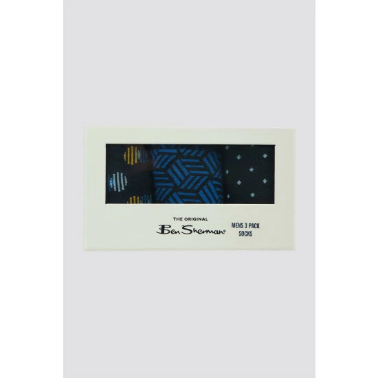Seabiscuit 3 Pack Gift Socks by Ben Sherman. 3 Pairs of cotton blend socks with Ben Sherman logo design branding above the heels in a variety of navy prints. Soft and comfortable, plus versatile in both casual and smart outfits. A great gift for yourself or someone else. Mens size 7-11.