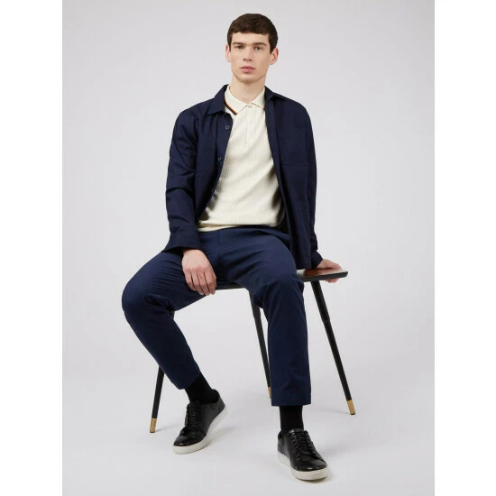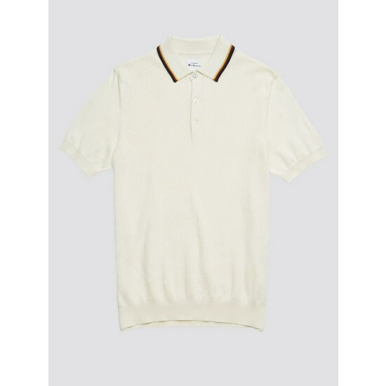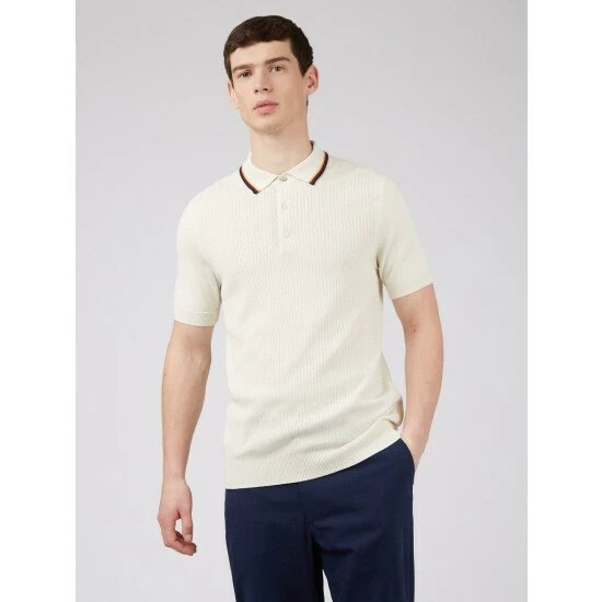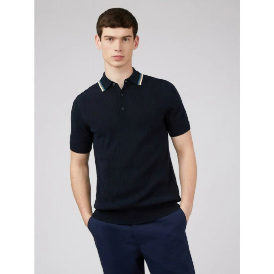 Textured Polo by Ben Sherman. A short sleeve knitted polo with 3 button fastening. Designed with a lightweight textured front and contrast tipping to the collar. Branded with tonal Ben Sherman signature sleeve embroidery.